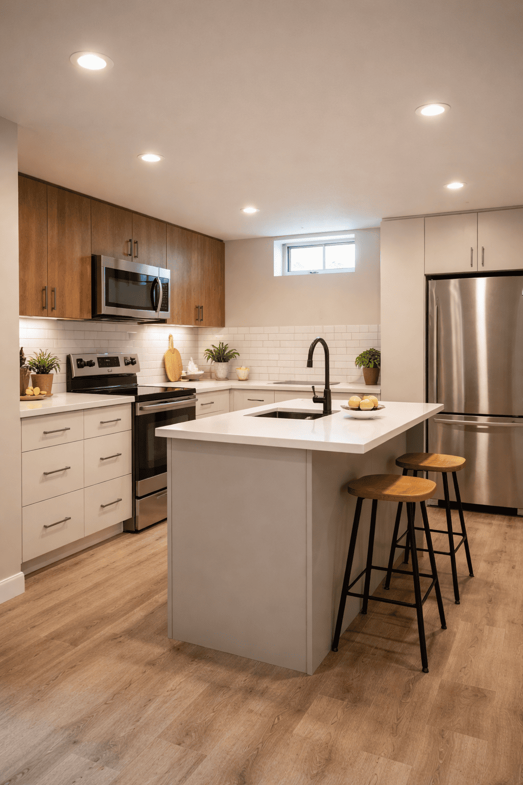 We transformed an unfinished basement into a fully functional rental suite with kitchen, bathroom, and bedroom.